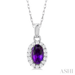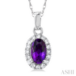 Oval Shape Amethyst & Halo Diamond Pendant Necklace 5x3 MM Oval Shape Amethyst and 1/20 Ctw Single Cut Diamond Halo Semi-Precious Pendant with Chain in 10K White Gold Total Diamond Weight (Appx.): 0.07 ctw Chain: Rope Chain 0.40 MM in 18 Inches with Spring Lock