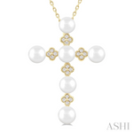 Cross Pearl & Diamond Fashion Pendant Necklace 4 MM Round Shape Cultured Pearl and 1/10 Ctw Clover Round Cut Diamond Cross Pendant With Chain in 10K Yellow Gold Diamond Weight: 0.10 ctw Chain: Cable Chain 0.85 MM in 18 Inches with Spring Lock & Extenders at 16" & 17"