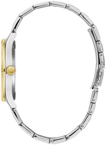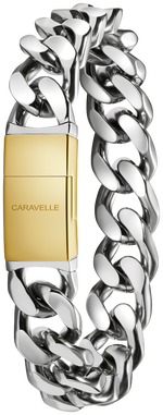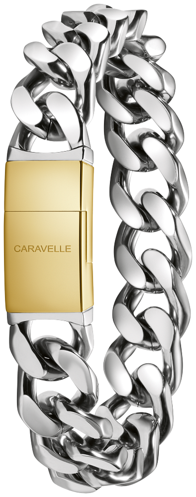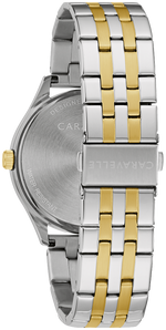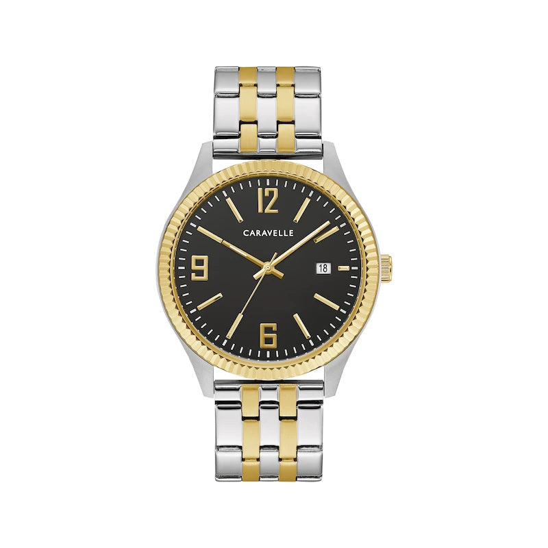 Caravelle by Bulova Men's Two-Tone Stainless Steel Watch with Black Dial with Matching Link Bracelet The black dial features gold-toned hands and markers and a date display at 3 o'clock. 41.0mm stainless steel case with mineral crystal and a coin-edged gold-toned bezel Japanese quartz movement keeps accurate time. The two-toned stainless steel link bracelet secures with a fold-over clasp with push buttons. Water resistant to 30 meters, this watch includes a 3-year limited manufacturer warranty. The curb chain bracelet secures with gold-toned magnetic closure.