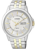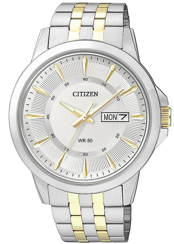 Citizen Men's Two-Tone Stainless Steel Quartz Watch Silver tone dial. Day and date display. Case size: 41mm. Scratch resistant mineral crystal. Water resistant: 50 meters / 165 feet. Movement: Quartz (Battery). Comes with original box and booklet. Warranty: 5 Years.