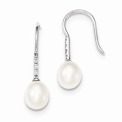 Sterling Silver 7-8mm White FW Cultured Pearl CZ Dangle Earrings