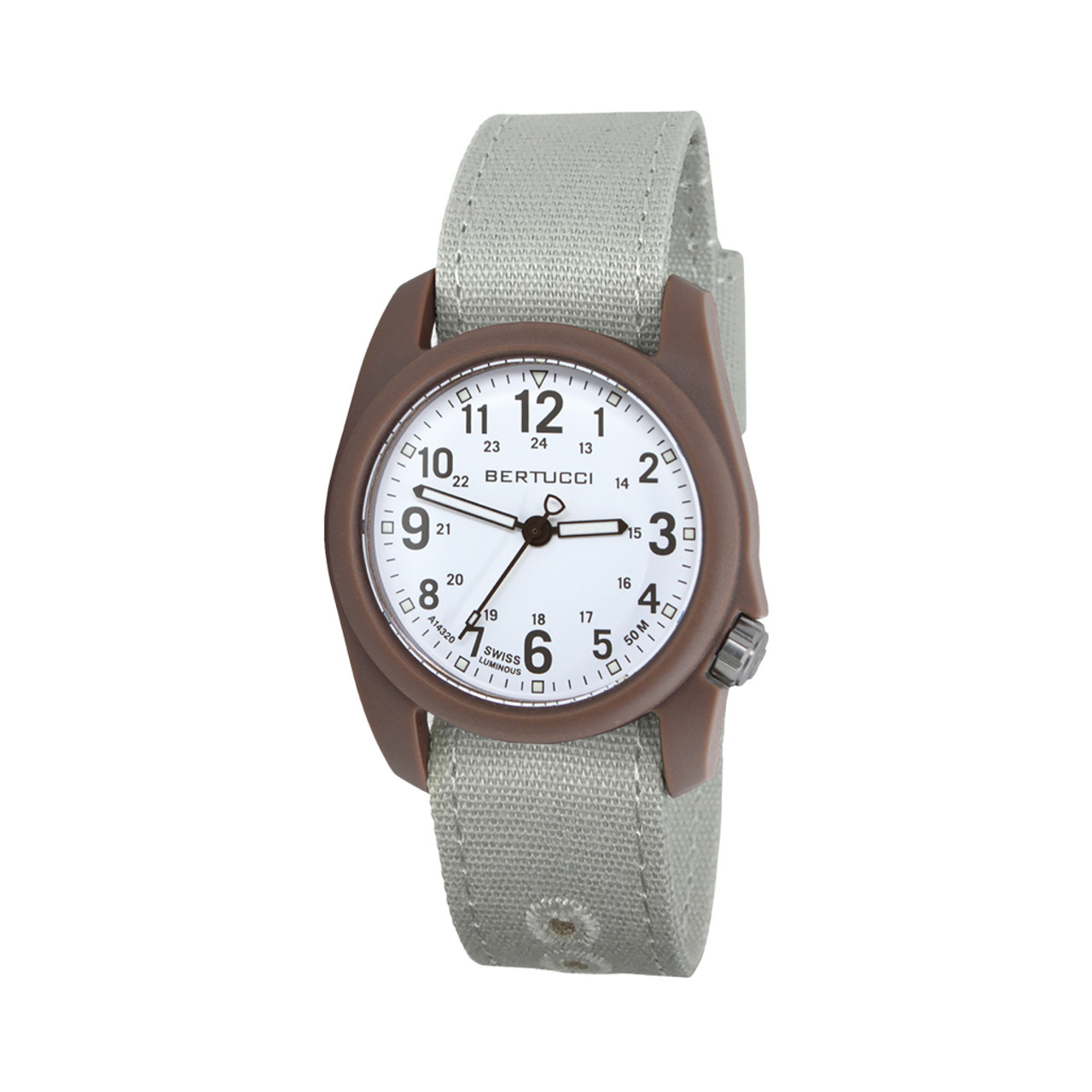 Bertucci DX3 Resin Watch, Canvas Strap and White Dial *US Patented Unibody Case *Stainless Steel Crown and Back *Scratch Resistant Mineral Crystal *50m Water Resistant *Swiss Super Luminous *Japan Movement *4 Year Battery *3 Year Warranty