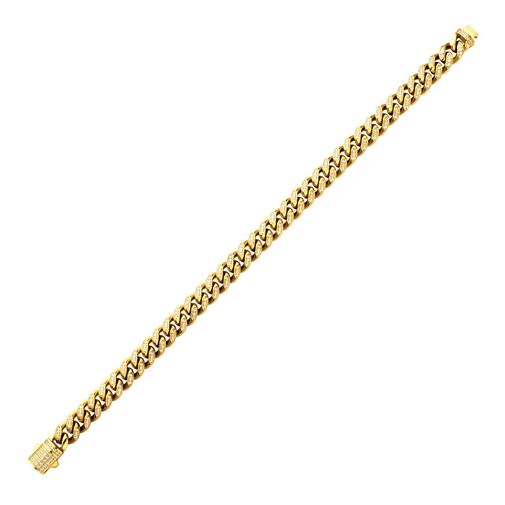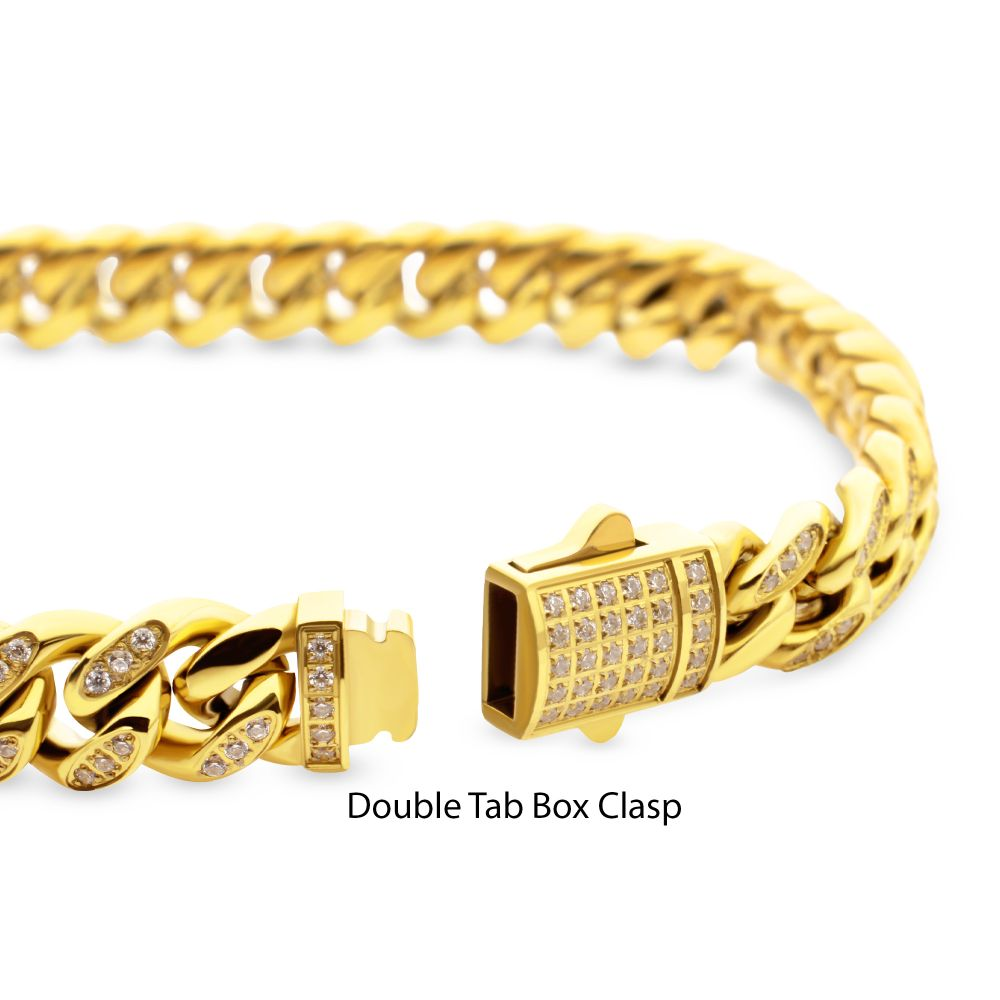 Men's 8mm 18Kt Gold IP Steel Miami Cuban Chain Bracelet with 1mm CNC Set Clear Cubic Zirconia with Double Tab Box Clasp