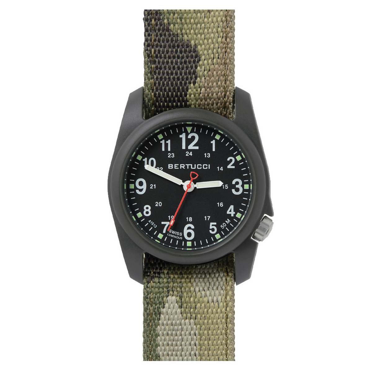 Bertucci DX3 Camo Resin Watch, Nylon Strap and Black Dial *US Patented Unibody Case *Stainless Steel Crown and Back *Scratch Resistant Mineral Crystal *50m Water Resistant *Swiss Super Luminous *Japan Movement *4 Year Battery *3 Year Warranty