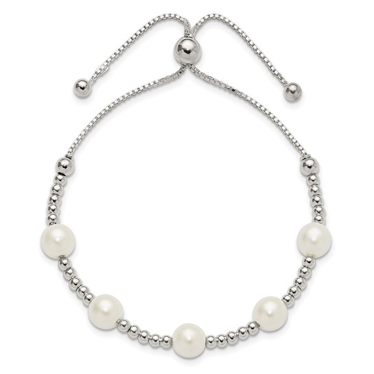 Sterling Silver Polished Beaded and Synthetic Pearl Adjustable Bracelet