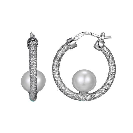 Sterling Silver Mesh Earrings (25x3mm) with Freshwater Pearls (Size 9.5-10mm), Snap Bar, Rhodium Finish